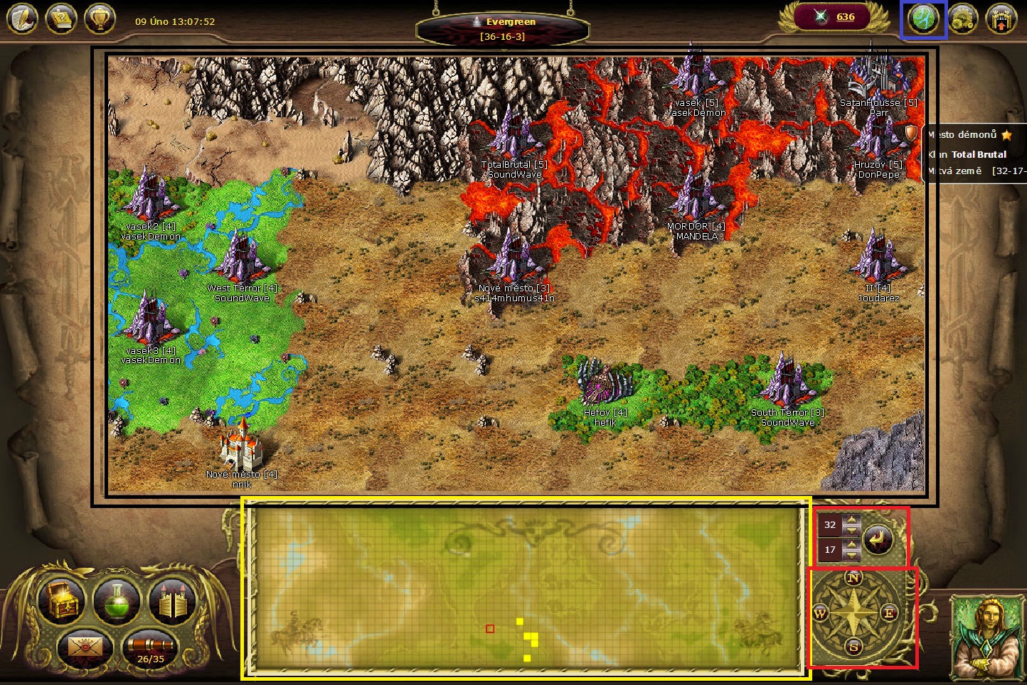 Když vystoupíš z města na mapu, tak uvidíš mapu jednoho království, kde máš to město ze kterého jsi vystoupil na mapu (černě orámováno) o jaké království se zrovna jedná vidíš vpravo dole (na screenu 32-17 červeně orámováno). Ty dva červeně orámované čtverce ti pomáhají v orientaci v královstvích - horní rám ti umožňuje ručně nebo pomocí šipek se přesunout okamžitě na jiné království a dolní rám tě přesunuje o jedno podle toho na jakou světovou stranu potřebuješ (nahoru dolu, doprava, doleva). Pokud se v tom orientuješ, tak ručně můžeš přesouvat podle mapy všech království (žlutě orámováno).